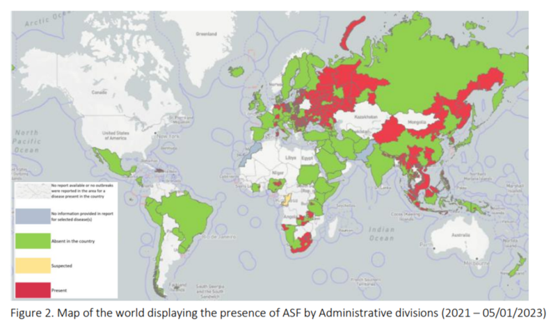 Since 2021, ASF has been reported in 50 countries around the globe, affecting more than 944,000 domestic pigs and 27,000 wild boars with more than 1,450,000 animal losses (deaths plus animals killed and disposed of) according to the World Organization of Animal Health. In July 2021, ASF was first reported in the Dominican Republic and Haiti, the closest the virus has been to the continental United States in decades.